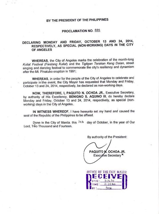 NO CLASSES ON THE FOLLOWING DATES: OCT. 13, 2014 LA NAVAL FIESTA Oct. 24, 2014 in observance of Fiestang Kuliat in Angeles City